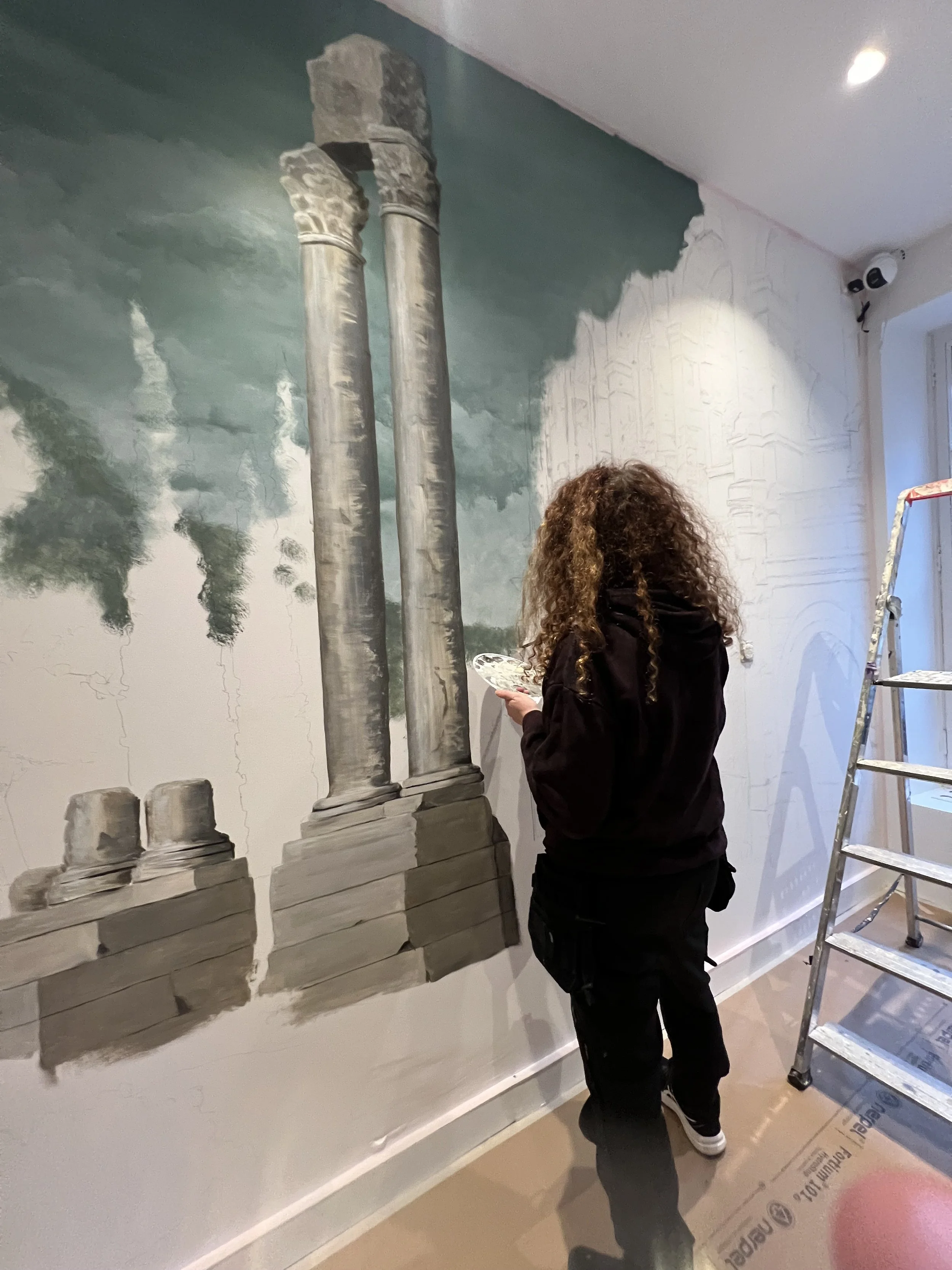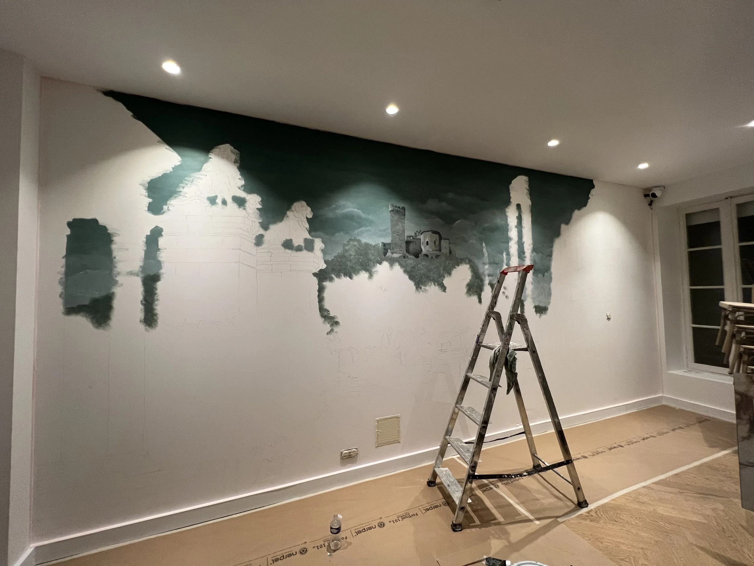Créer une fresque en dialogue avec l’architecture du lieu, capable d’accompagner les perspectives et d’installer une atmosphère.