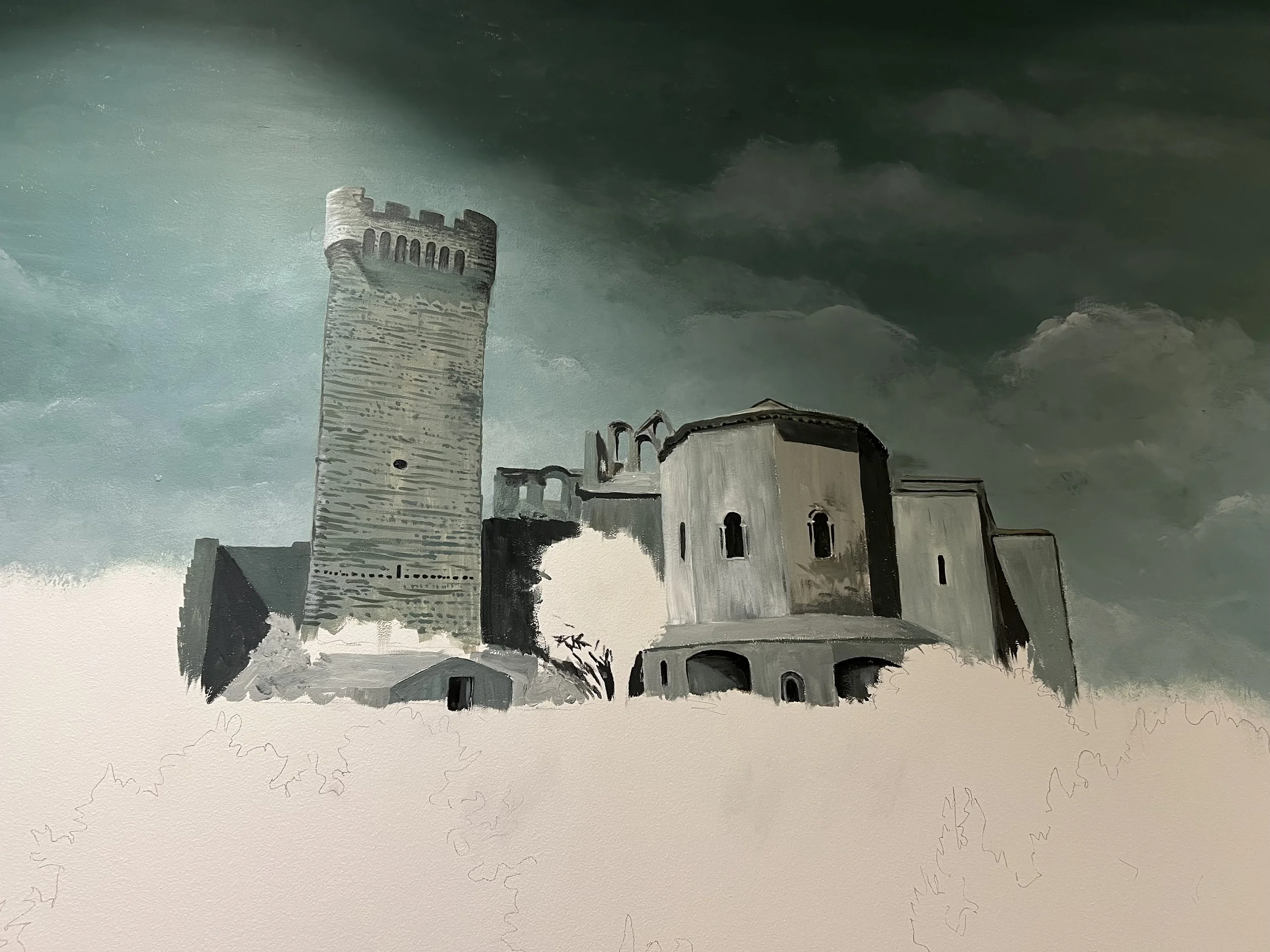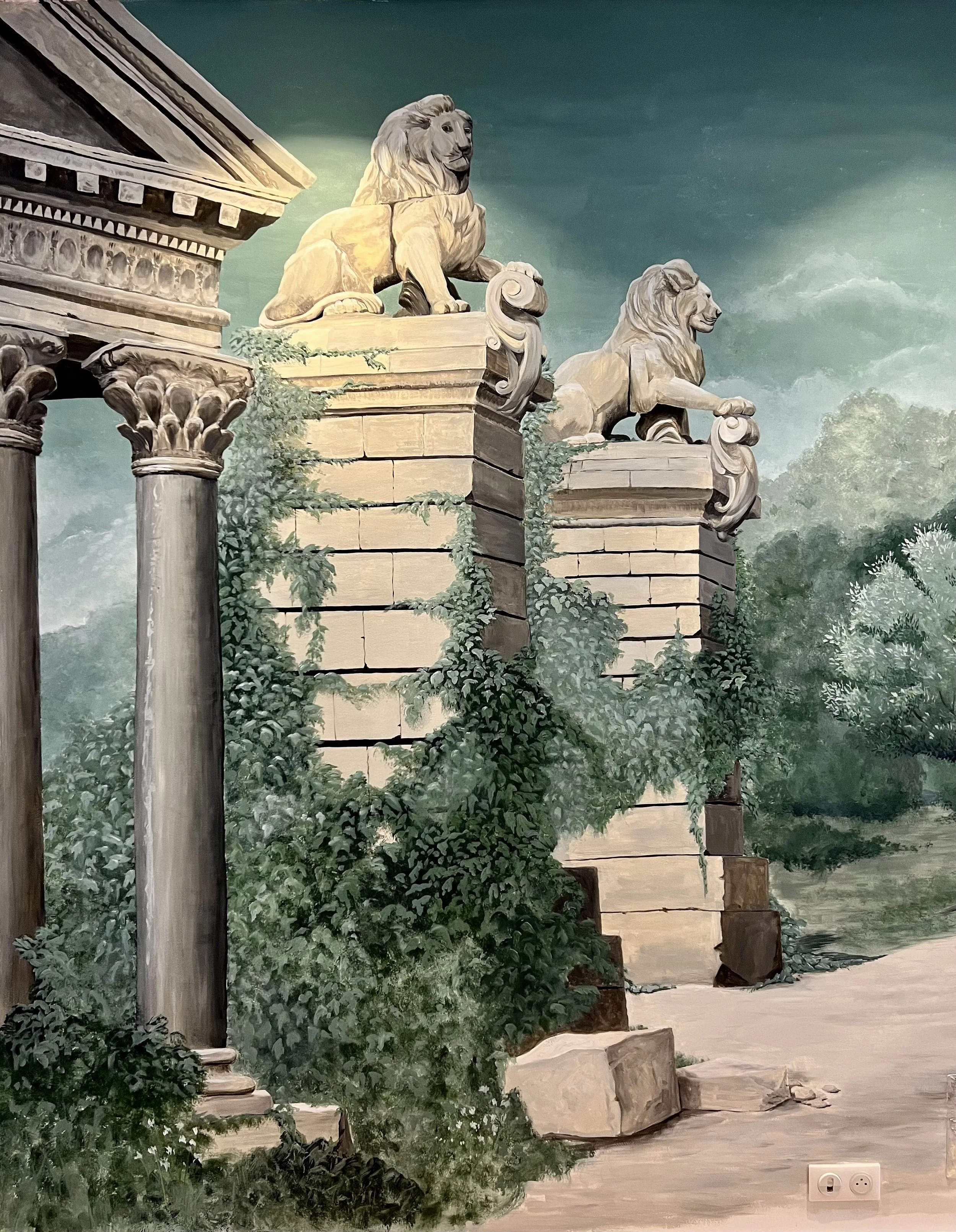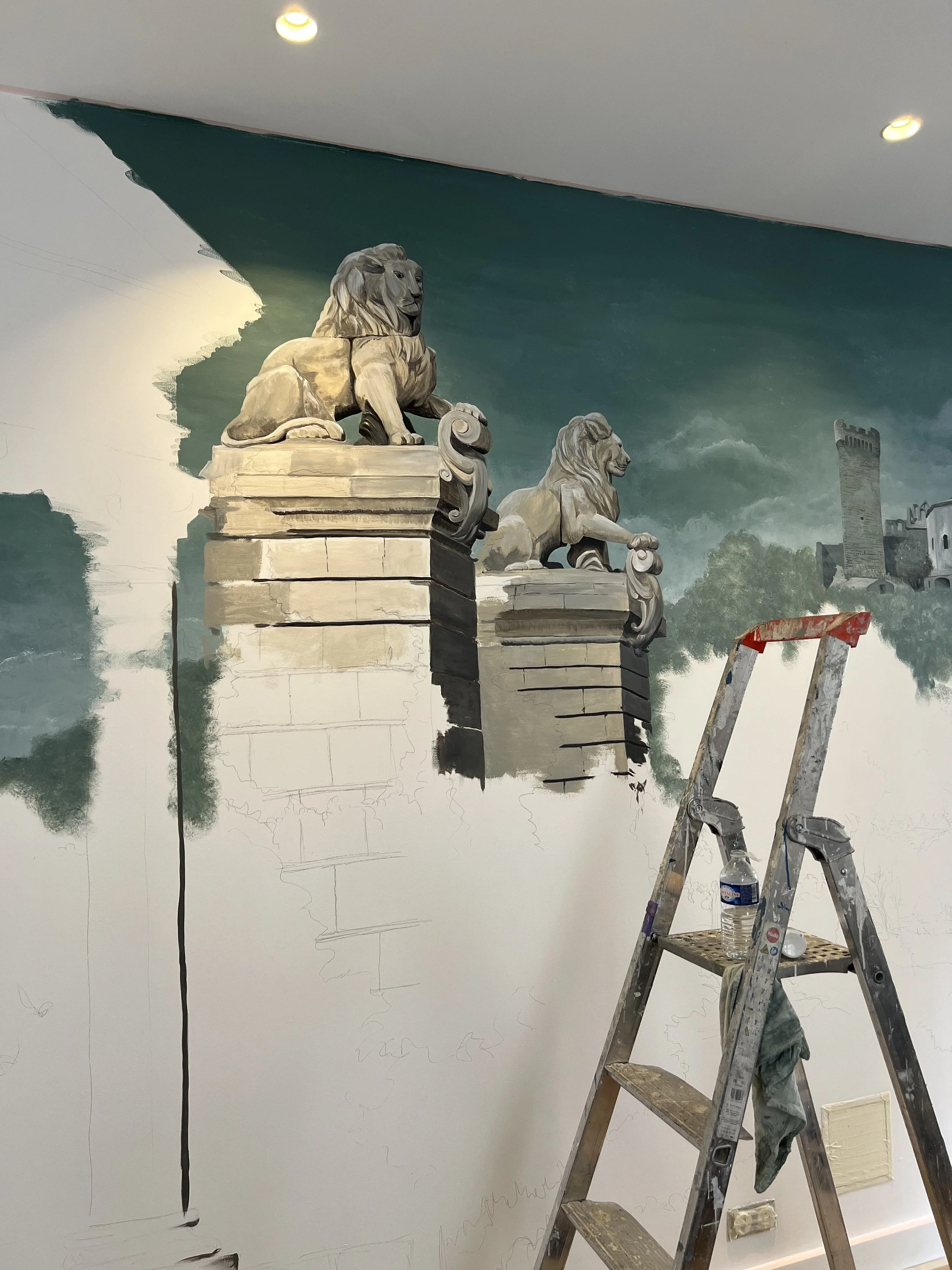 Fresque réalisée à l’acrylique, avec une palette douce et patinée, entre architecture et végétation.Fresque murale réalisée pour une salle de restaurant.