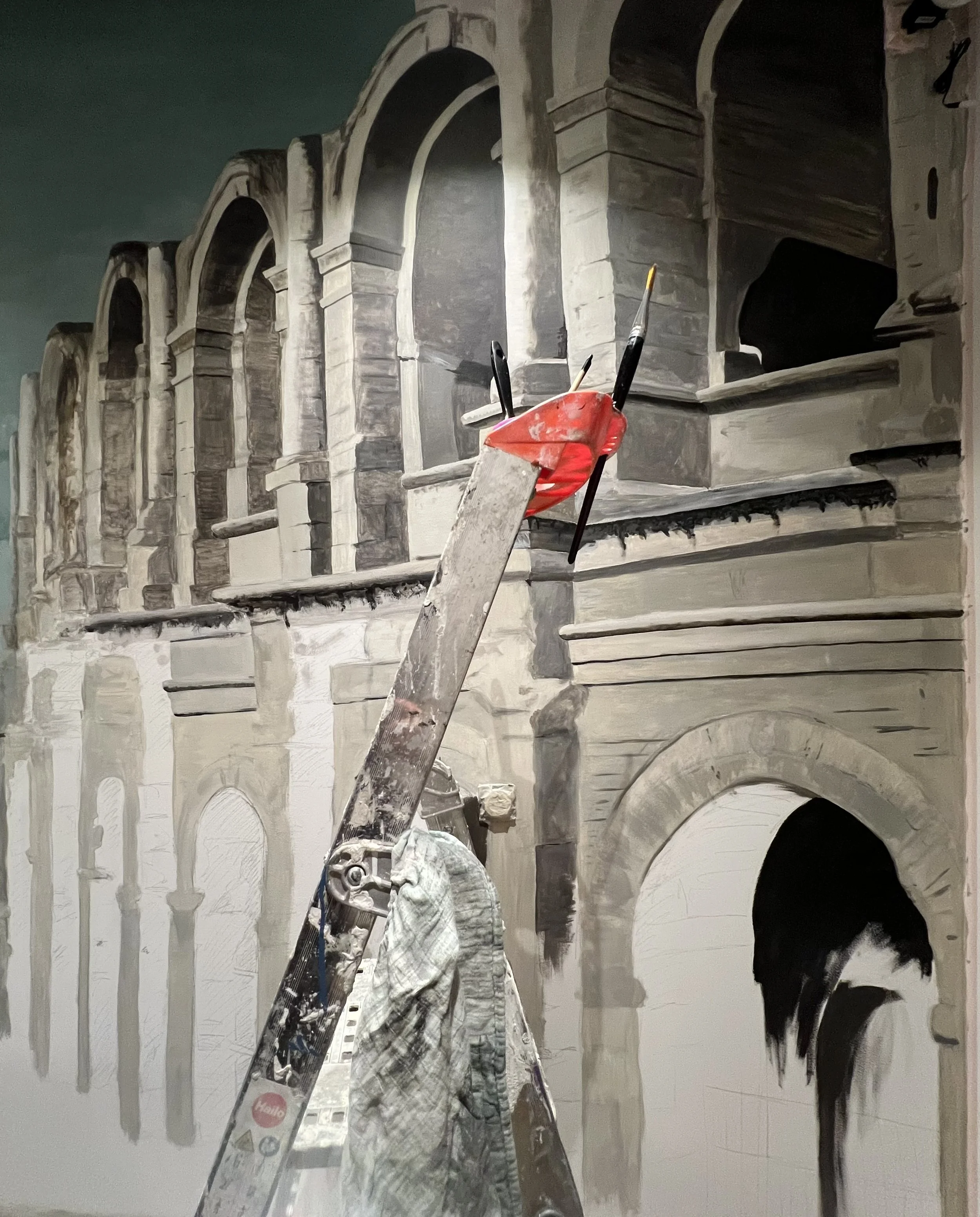 Sur un mur de 6,20 × 2,75 m, la composition rassemble des fragments emblématiques de la ville — colonnes antiques, lions, Abbaye de Montmajour, théâtre antique, arènes — comme autant de présences silencieuses.