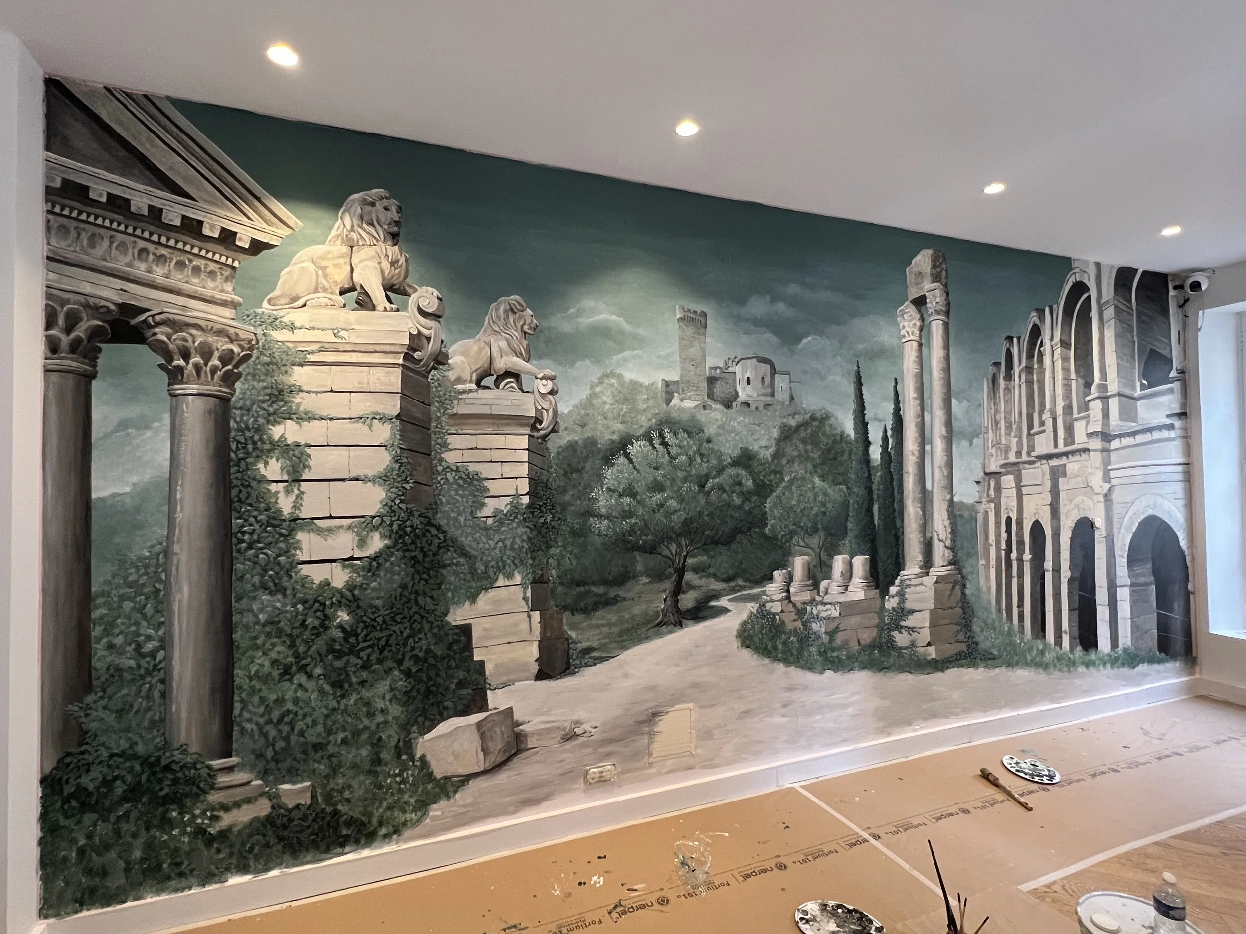Fresque murale réalisée pour la salle de restaurant de la pizzeria Casa di Viotti, à Arles.