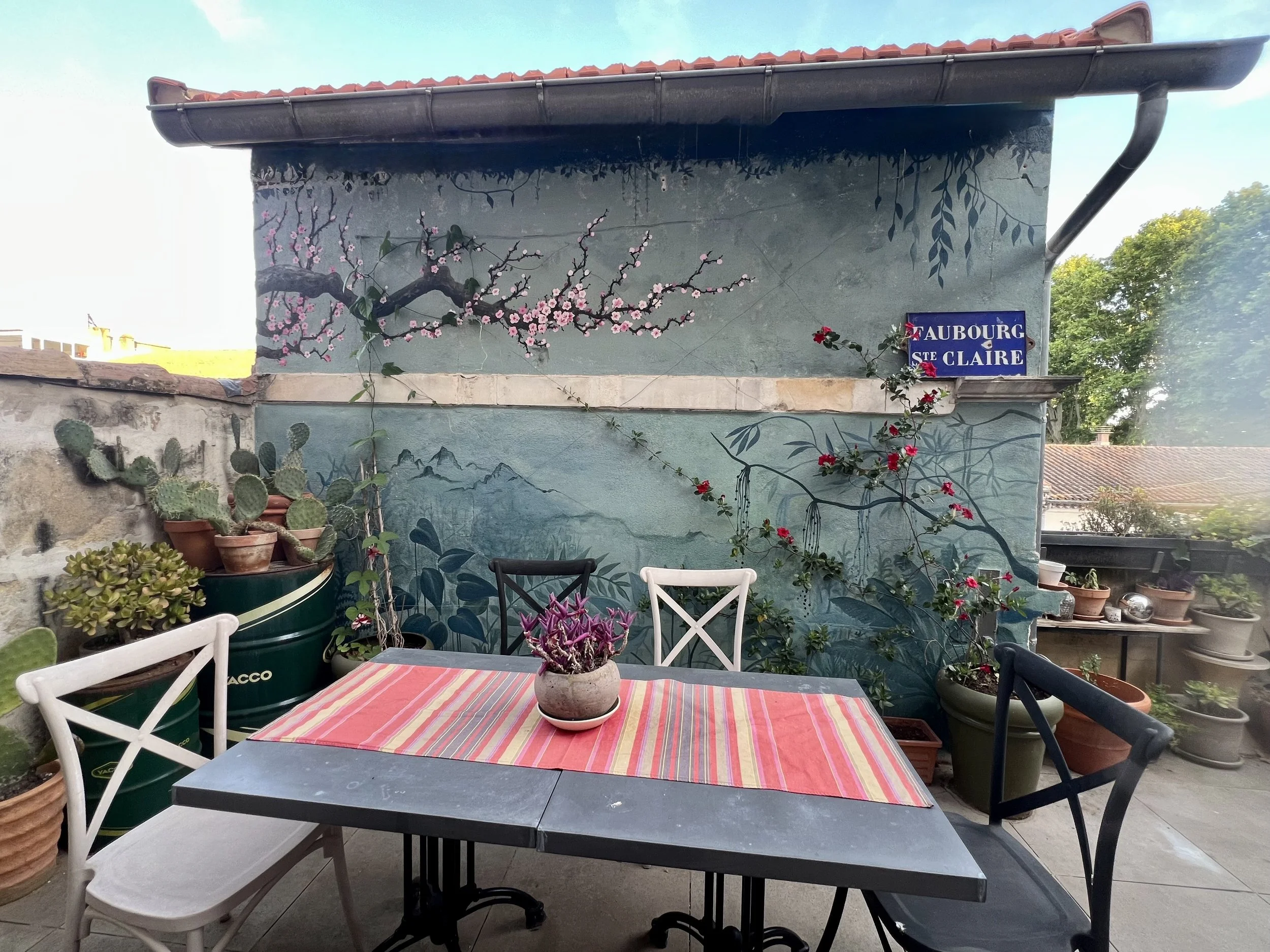 Fresque murale réalisée à l’acrylique sur une terrasse à Arles.